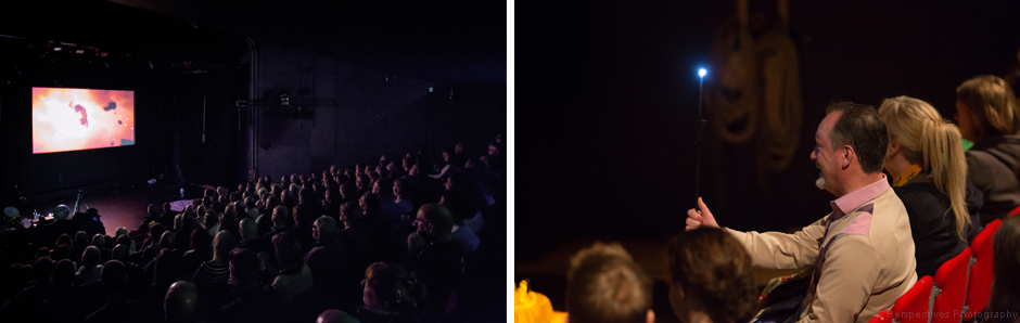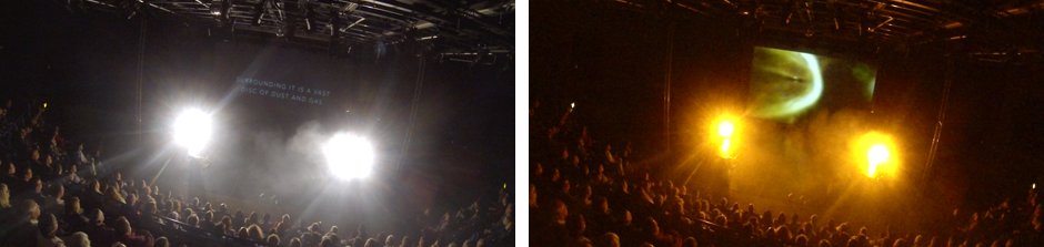 The Story of the Solar System set – at left awaiting the audience and at right during the show (with Will on stage holding a replica of one of Galileo’s telescopes).