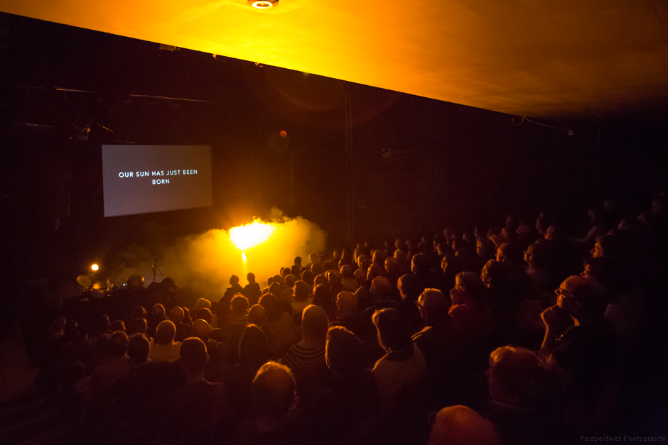 Fish-eye views of the show’s opening sequence – the audience watches as the Sun is born, surrounded by a vast disc of dust and gas. Credit: Will Gater