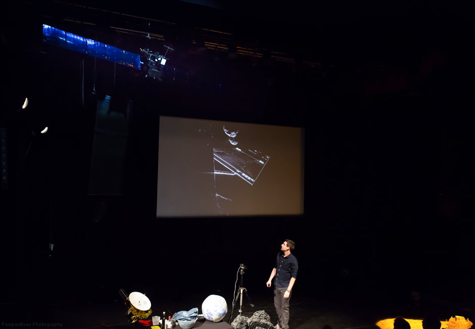 Will on stage during the first half and (at right) a publicity image of the model Philae lander and its final resting site on Comet 67P.