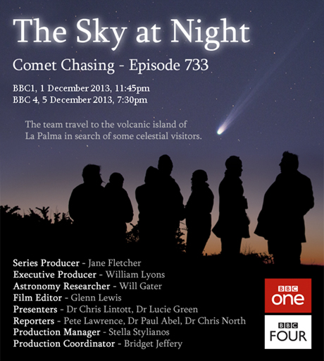 In late November 2013 the BBC’s The Sky at Night team travelled to La Palma in the Canary Islands to observe and study a handful of bright comets — including C/2012 S1 (ISON) and C/2013 R1 (Lovejoy) — with the professional telescopes located at the Roque de Los Muchachos Observatory.
